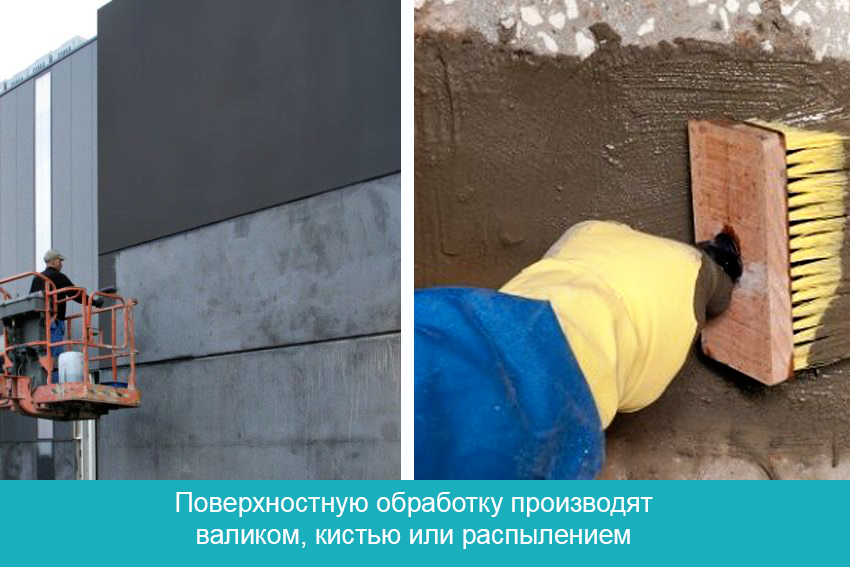 Суть метода – нанесение тонкого слоя водоотталкивающего вещества на поверхность готового бетона. Чаще всего данный способ применяется для защиты фасадов и ограждений.