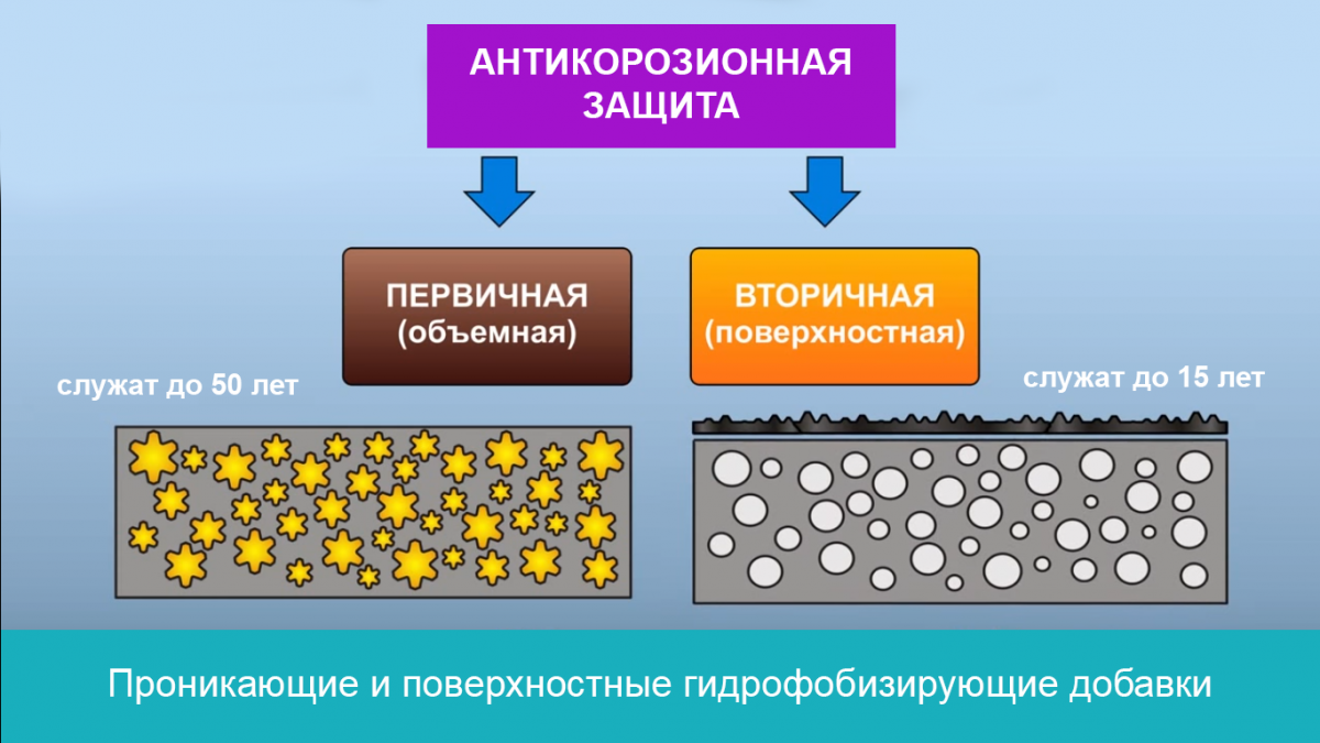 На первый план выходят специальные пропитки и добавки в бетон на основе кремнийорганических соединений. Добавки образуют плотную структуру бетона, а пропитки Они образуют настолько тонкую пленку, что не забивают микропоры бетона, а только обволакивают их. В результате бетон защищен от разрушительного воздействия влаги, но при этом «дышит».