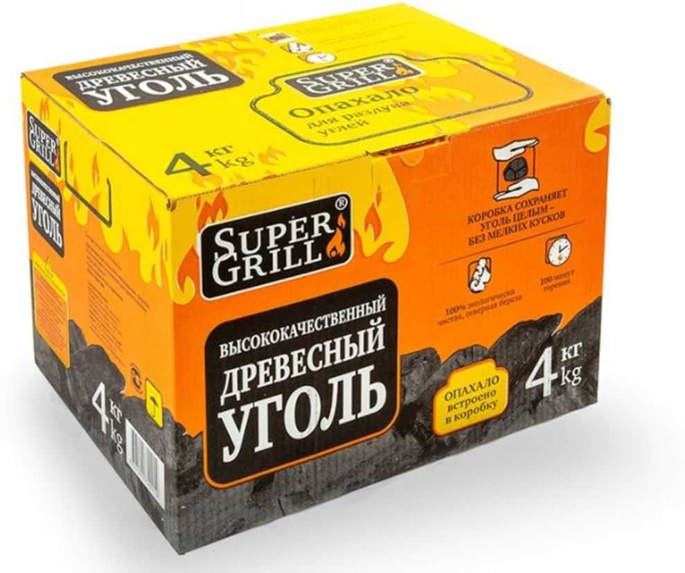 В продаже представлен древесный уголь в упаковках различного веса. Его отличительной особенностью является пожаробезопасность. Для производства древесного угля Supergrill используется северная берёза. При горении изготовленное из неё топливо не выделяет канцерогены. Угли легко разжигать. Они долго тлеют и дают равномерный жар.