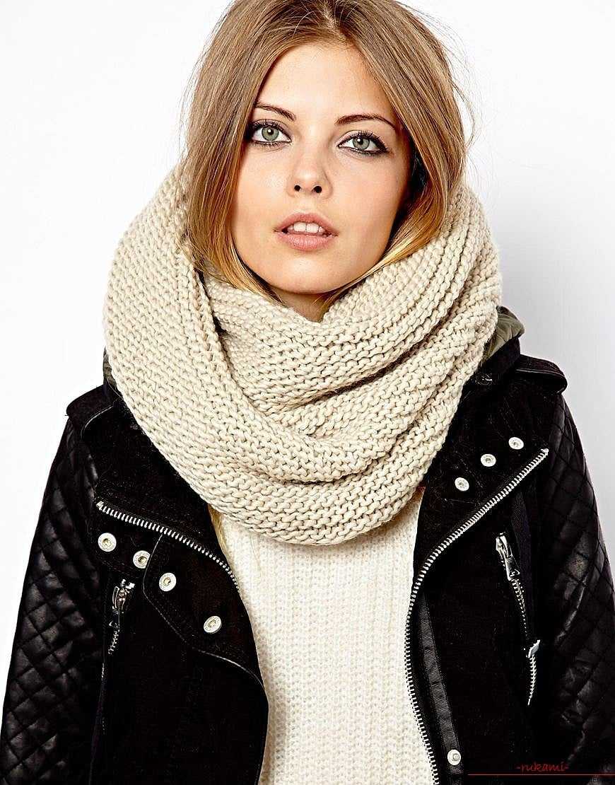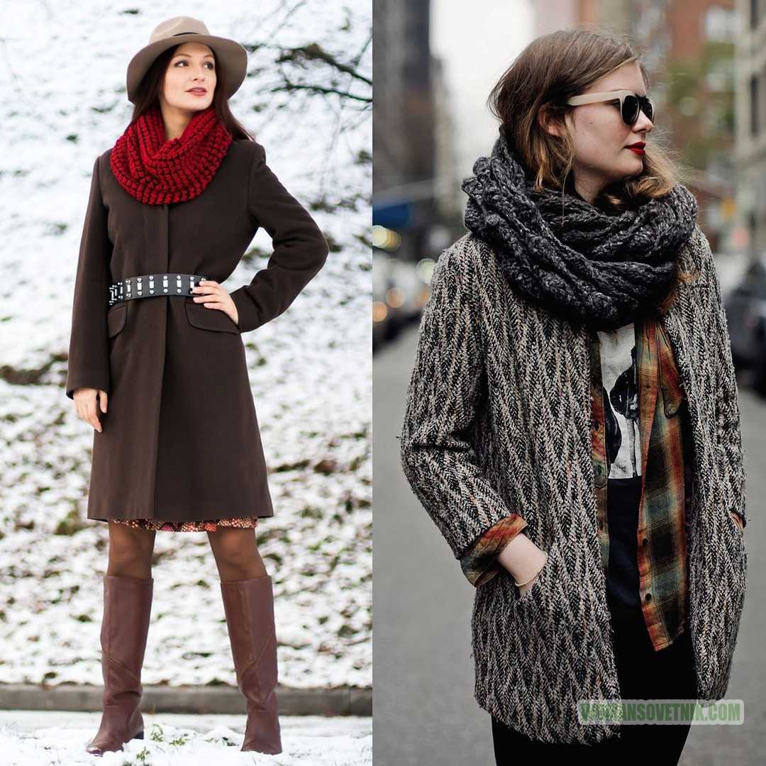 - Разнообразие фасонов, цветов и материй позволяет подобрать модель под собственный стиль. Узкая труба смотрится сдержанно, длинный хомут, обмотанный в несколько колец — ультрамодный тренд, а к тому же — очень тепло и уютно.