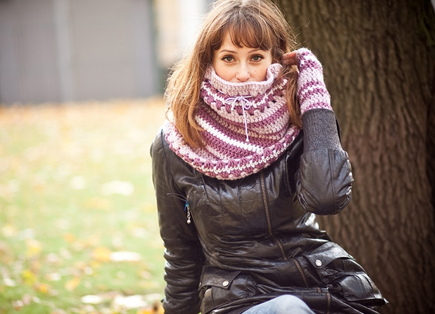 «Под курткой» означает, что сначала вы надеваете снуд, а потом куртку. Внешне снуд выглядит менее заметным, но если правильно подобрать цвета, сделать их контрастными или яркими, то смотреться это будет красиво.