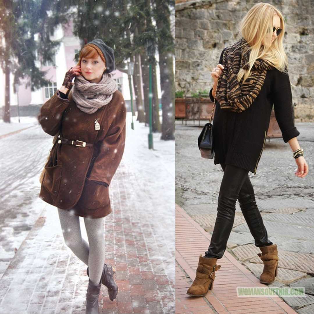 Для создания повседневного образа подойдет модный вязаный хомут, сочетающийся по цвету с перчатками и шапкой. Допустимо сочетание шарфа с капюшоном пуховика, петли при этом должны лежать под капюшоном.