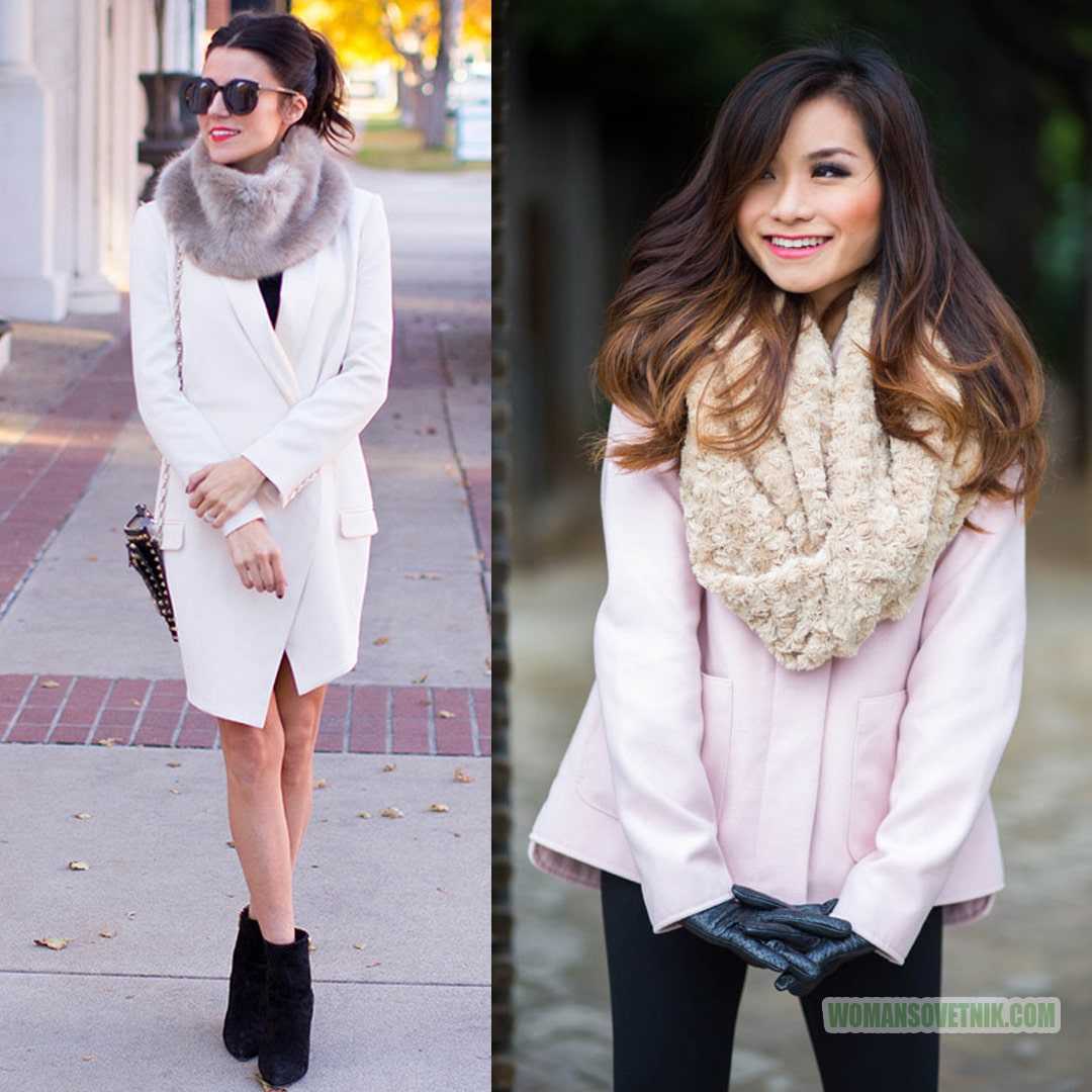 С демисезонным пальто шикарно смотрится меховой шарф труба – расправьте его по плечам как своеобразную пелерину, а свободный конец наденьте на голову. Более узкие модели можно носить с пальто как болеро, а совсем короткие – как шапку-тюрбан.