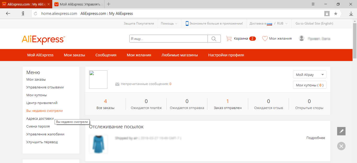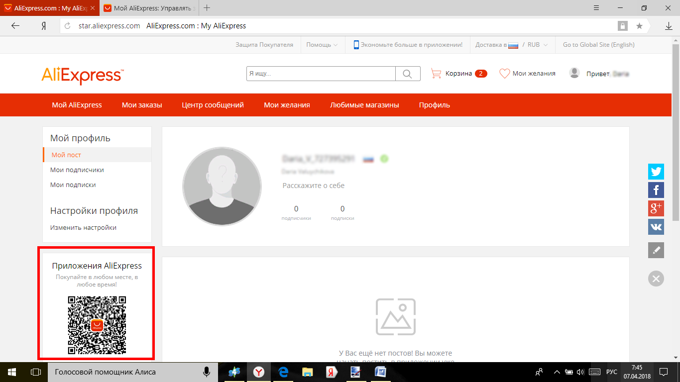 Раздел Мой Алиэкспресс – ваш основной профиль, в котором нужно будет внести необходимую информацию;