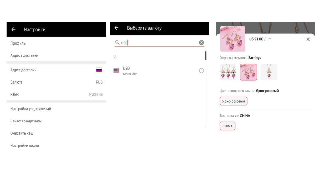 - Отправка из… — нажмите на выпадающий список и выберите, откуда вы хотите получить товар (обычно, Китай или РФ), при этом все предложения из других стран будут скрыты;