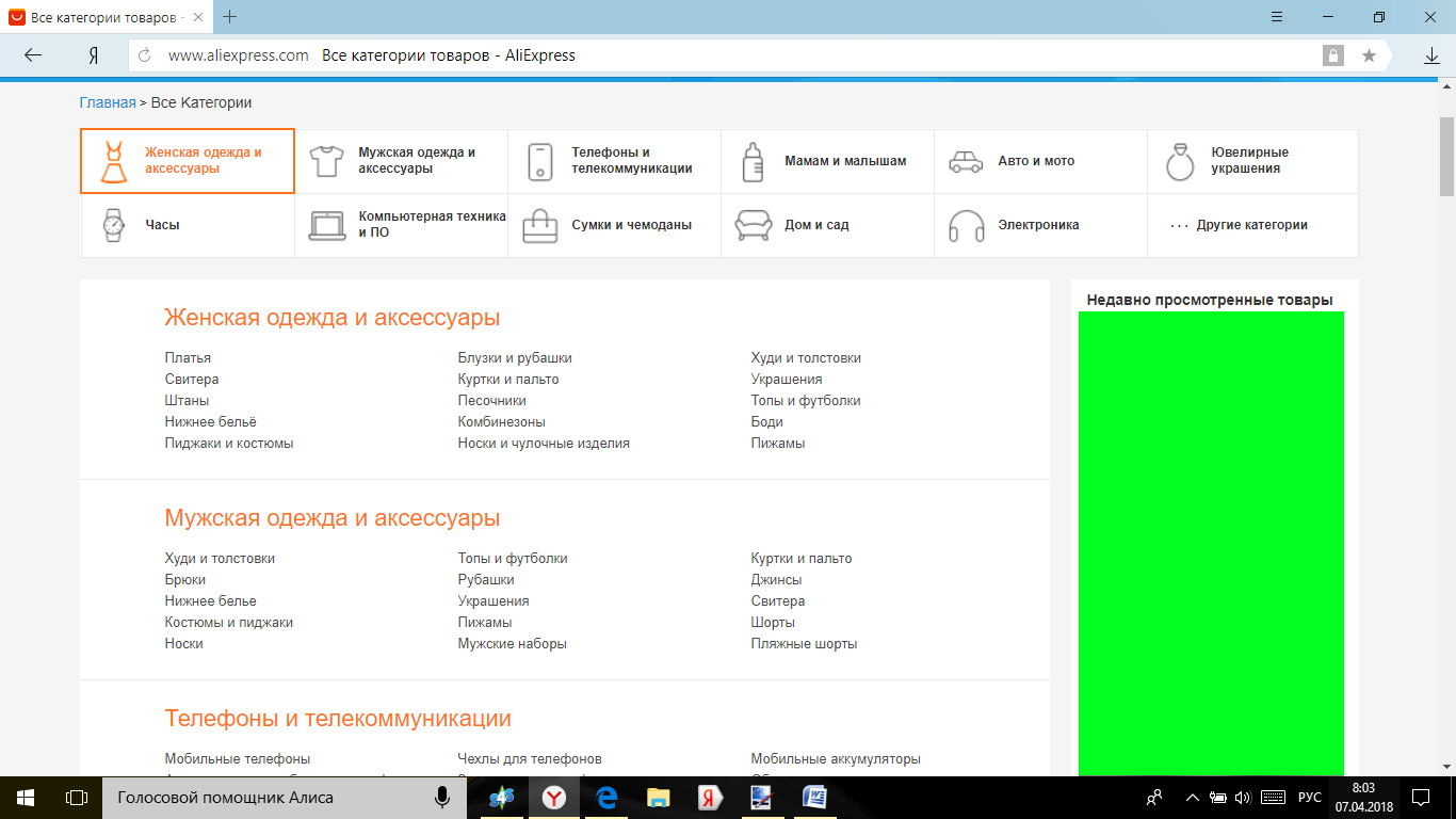 Более длительный и сложный способ – поиск по категориям, список которых расположен слева на Главной странице. Каждая из них имеет множество подкатегорий, перемещаясь между которыми можно в конце концов найти необходимый товар. Однако в большей степени такой способ подойдет тем, кто не знает, что конкретно хочет купить;