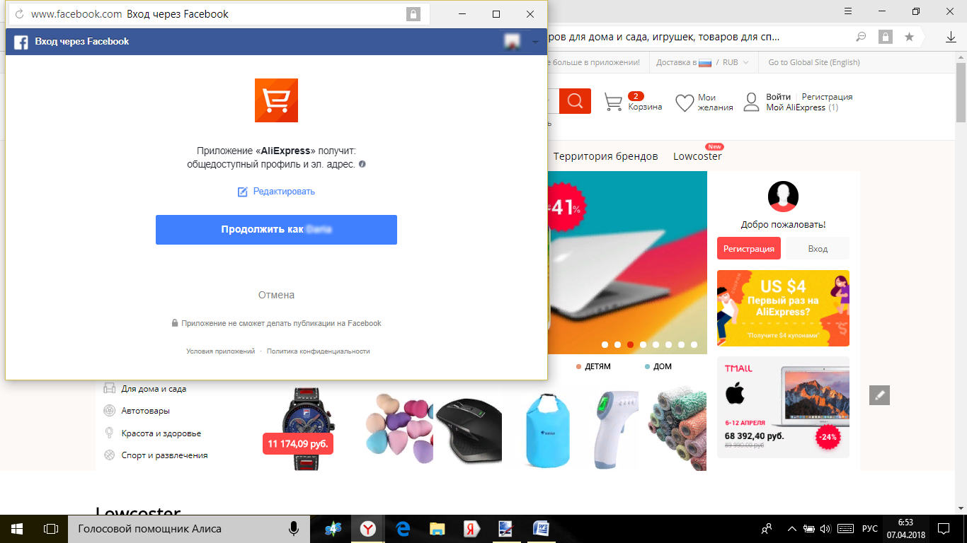 - Вы также можете войти в систему с помощью аккаунта в социальной сети – Вконтакте, Facebook, учетной записи в сервисах Google — для этого нажмите соответствующую кнопку над кнопкой Зарегистрироваться и укажите. С каким аккаунтом вы хотите осуществлять вход на Алиэкспресс;