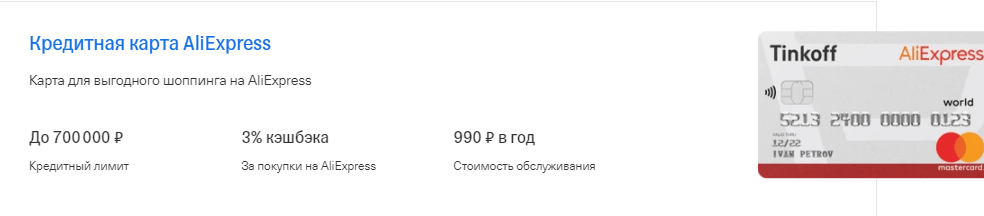 Кредитная карта AliExpress — tinkoff предлагает оформить кредитную карту со специальными условиями для Алиэкспресс и лимитом до 700 000₽ плюс вы получаете 3% кешбэк, оформление и доставка карты бесплатное.