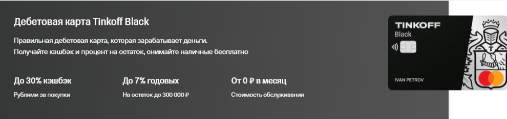 Tinkoff black — отличная карта которая позволит зарабатывать экономя. Оформление и доставка карты курьером бесплатная, бесплатное обслуживание при соблюдении условий или 99₽ в месяц. 1% кешбэк на все покупки, 2–15% кешбэк начисляется в выбранных вами категориях и до 30% кешбэк начисляется от партнеров.