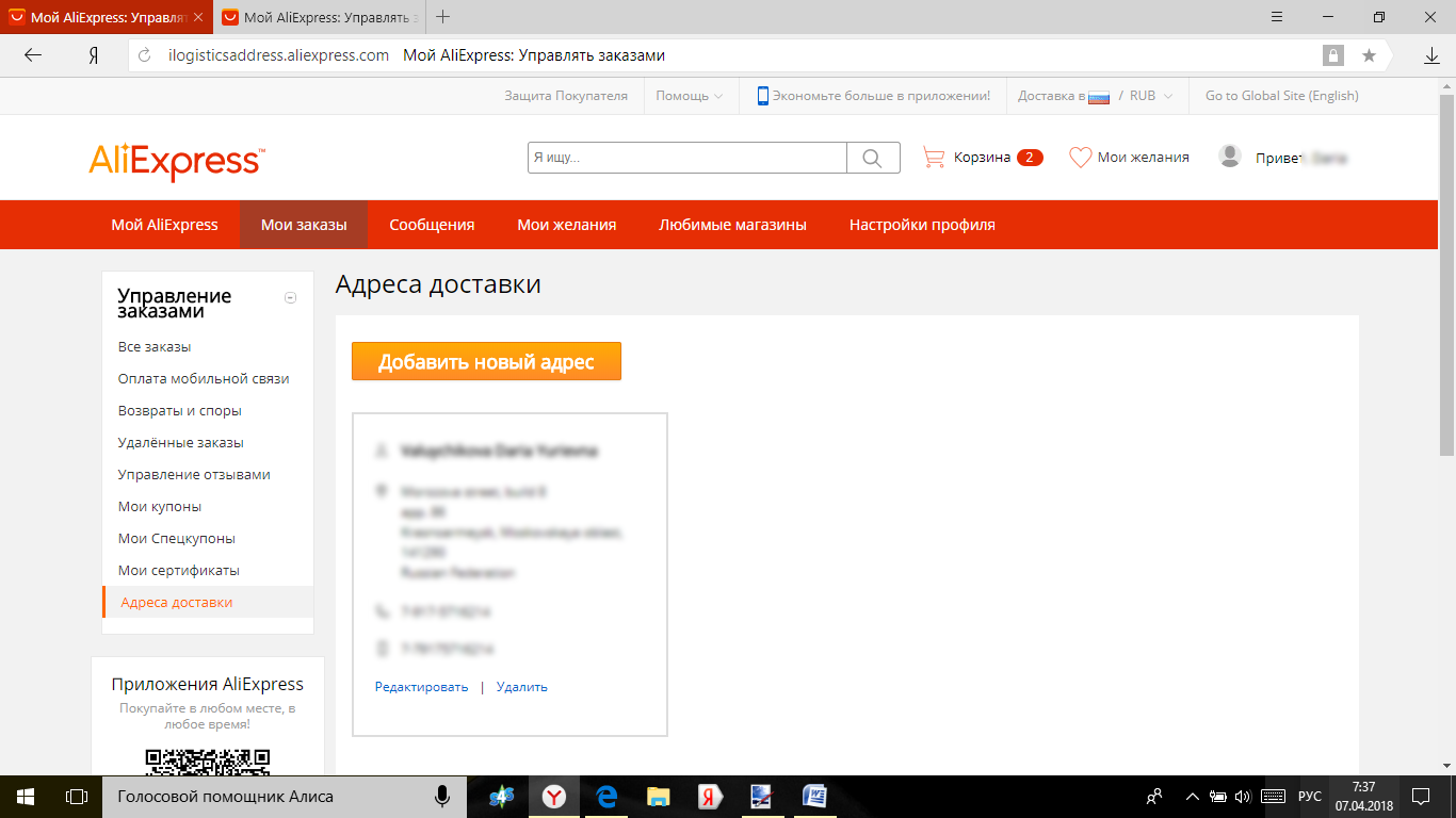 Вам необходим раздел Адреса доставки – перейдите в него и добавьте необходимые адреса, на которые может осуществляться доставка, чтобы в дальнейшем вы просто могли выбрать необходимый при покупке;