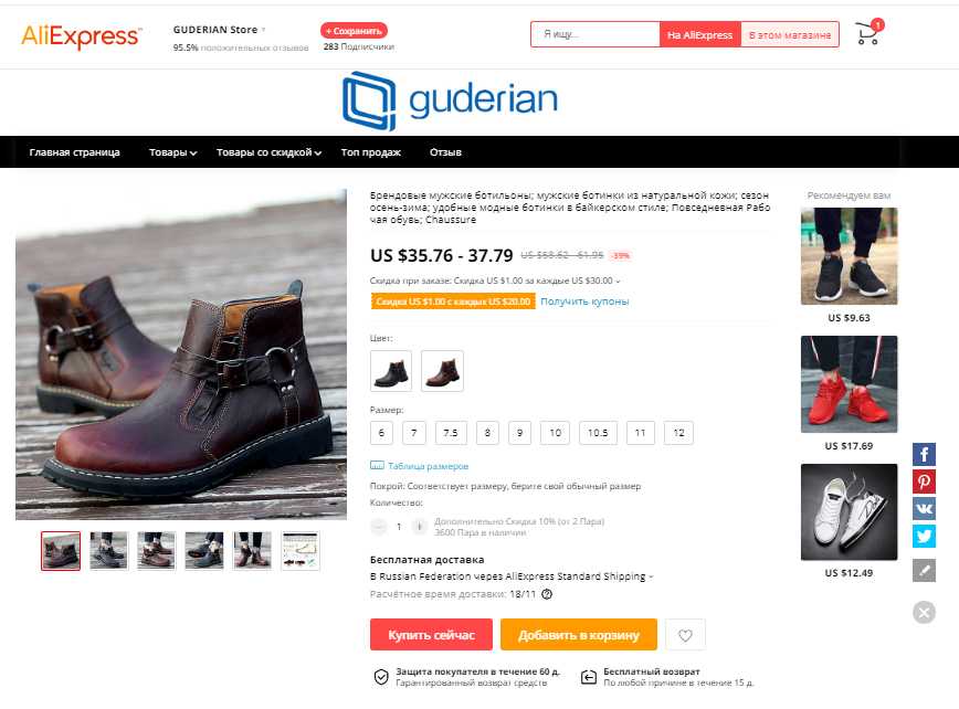 4. К примеру, мы выбрали мужские ботинки за 35.76$. Попробуем применить наш купон. Он дает скидку на 2$. Для этого товар нужно отправить в «Корзину». Там появится возможность использовать скидку продавца. Ниже расскажем как еще получить скидку от продавца и как ее потратить.