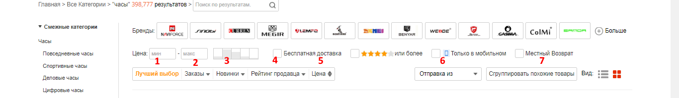 - Сгруппировать похожие товары – распределяет аналогичные предложения по группам.
