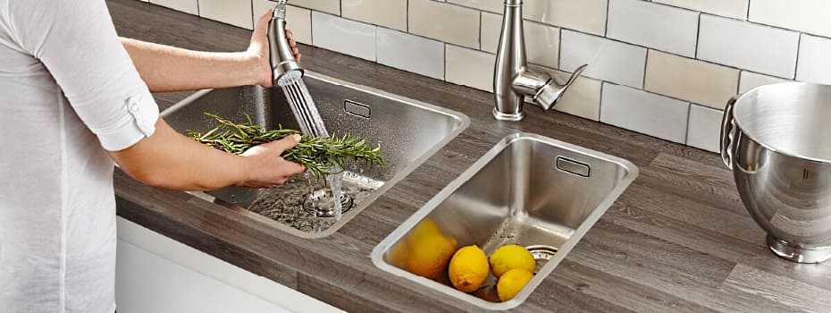 - Если размеры кухни позволяют ставить мойку с двумя или тремя чашами, то не сомневайтесь в правильности выбора такого изделия. Одну секцию можно будет использовать для мытья овощей и фруктов, а остальные – для хранения и последующего отмывания грязной посуды.