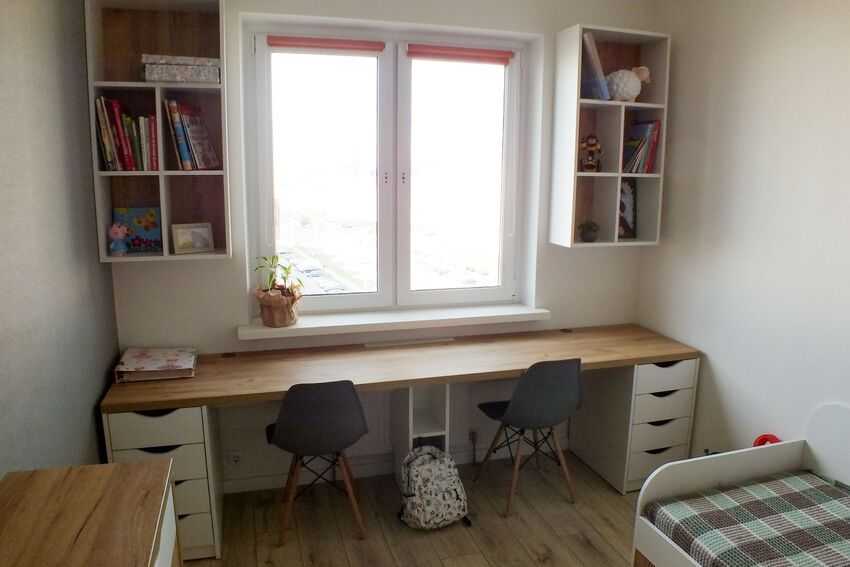 У каждого ребенка есть собственный блок с ящиками, где он сможет хранить школьные принадлежности. Ровный письменный стол для двоих школьников можно разместить вдоль окна или стены. Он тоже предоставит достаточно места для работы.