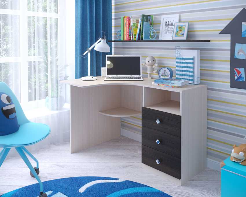 Угловой письменный стол – идеальный вариант для небольшой детской комнаты. Подобная конфигурация позволяет более эффективно использовать свободное пространство, особенно угловое. Благодаря увеличенной площади на столешнице можно установить монитор, принтер, настольную лампу, аудиоколонки и надстройки, а внизу расположить системный блок.