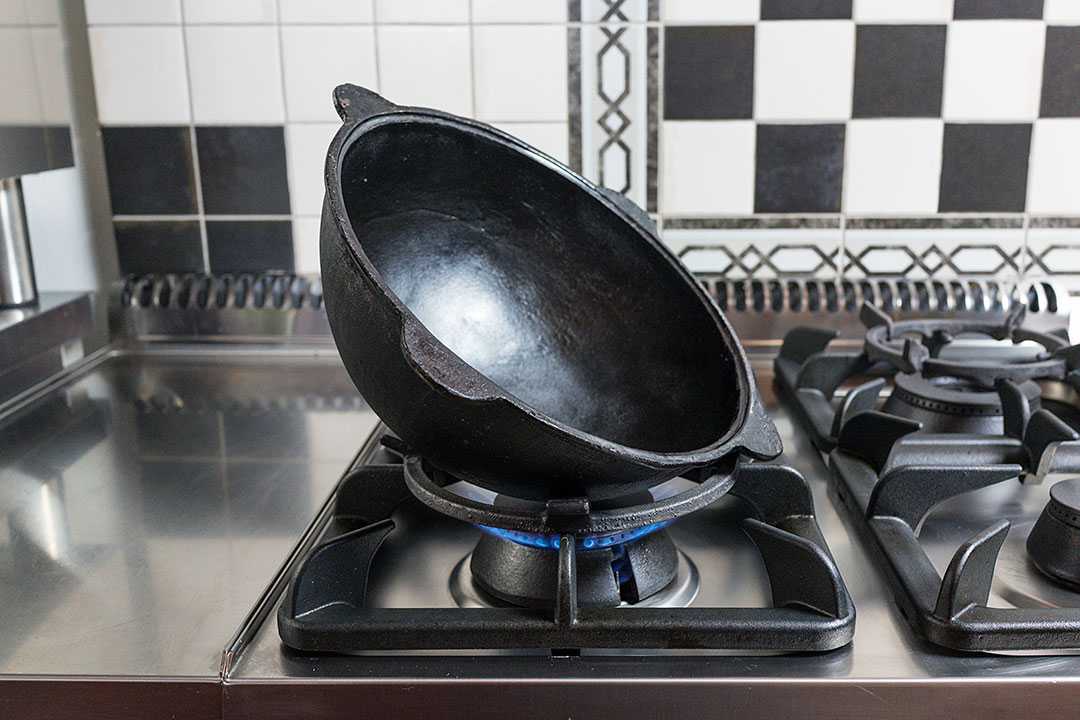 Особенность материала – естественное противопригарное покрытие. Фишка в том, что масло попадает в поры чугуна, где под воздействием высоких температур полимеризуется, образуя гладкую пленку на поверхности. Чтобы получить антипригарный эффект, чугунную посуду прокаливают (способы прокаливания в домашних условиях мы описали ранее) перед первым приготовлением.