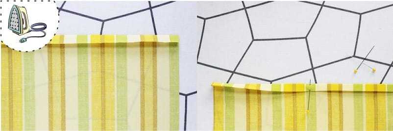 После этого аккуратно загибаем края перед тем, как их прострочить. Для этого ткань по 5 мм подворачивается дважды, после чего полосы тщательно проутюживаются.