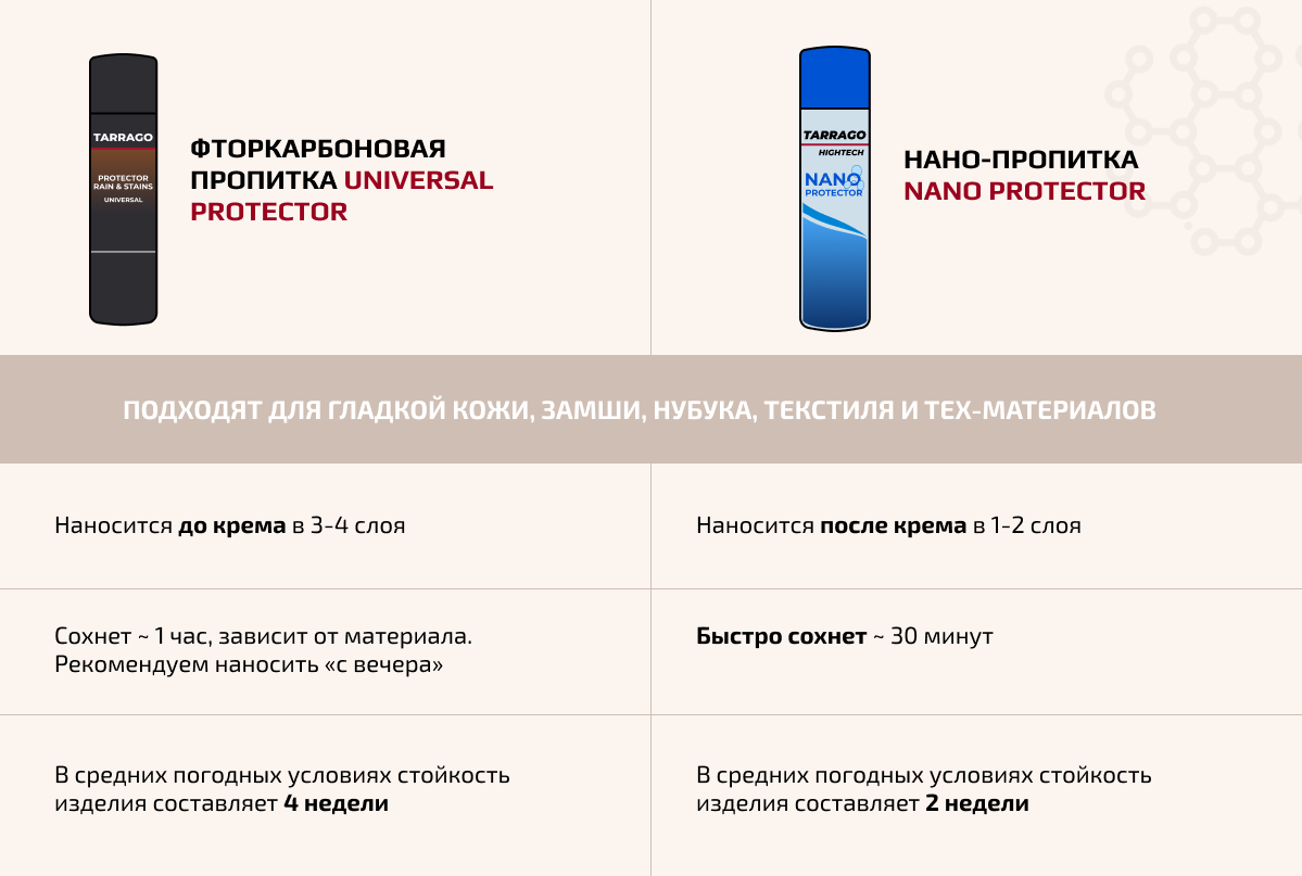Это водоотталкивающее средство пользуется популярностью благодаря натуральному и эффективному составу, в который входят смолы, масла, пропан и бутан. Поэтому спрей не вреден ни для человека, ни для обуви. Ее компоненты мягко воздействуют на структуру нубука, замши, всех видов кожи, текстиля, а вот для обработки дерматина это не лучший выбор, так как пропитывается он хуже. Также Tarrago Hightech Nano Protector с аккуратностью можно использовать для повышения водонепроницаемости сумок, замшевой и кожаной одежды.