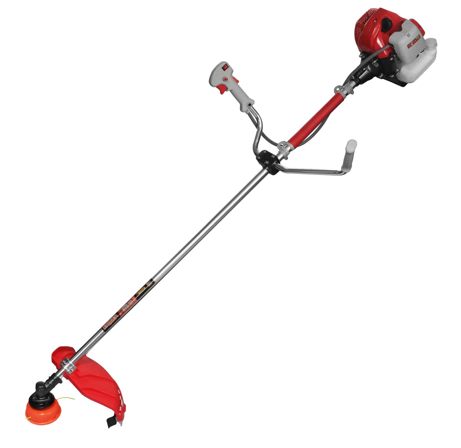 Это достаточно сложная, но весьма мощная модель, на выходе которой можно получить порядка 1,9 л.с. Благодаря увеличенным техническим характеристикам данной модели можно за один раз обработать порядка 20 соток земли. За счет высокого количества оборотов и значительной мощности, удается с легкостью справляться не только с мелкой травяной растительностью, но и с густыми зарослями, а также кустарниками. Запуск двигателя производится вручную. Объем бензобака составляет 0,55 л, расход бензина минимальный, поэтому им можно довольно долго работать без дополнительной заливки горючего. Оборудование оснащено системой гашения вибраций – руки и спина оператора не будут уставать во время работы. Косилка устанавливается на наплечный ремень. Масса устройства составляет порядка 6 кг, нагрузка распределяется равномерно. Рукоятка имеет возможность регулировки, поэтому состригать траву можно практически под любым углом.