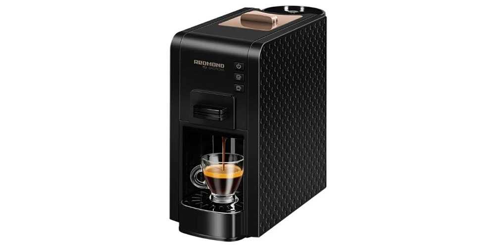 Лидером рейтинга стал REDMOND RCM-1527. Кофемашина имеет довольно простой, но интересный вид за счет необычной отделки боковых стенок корпуса и оригинальной крышки сверху. У нее довольно вместительный съемный резервуар для воды – на 1 л.