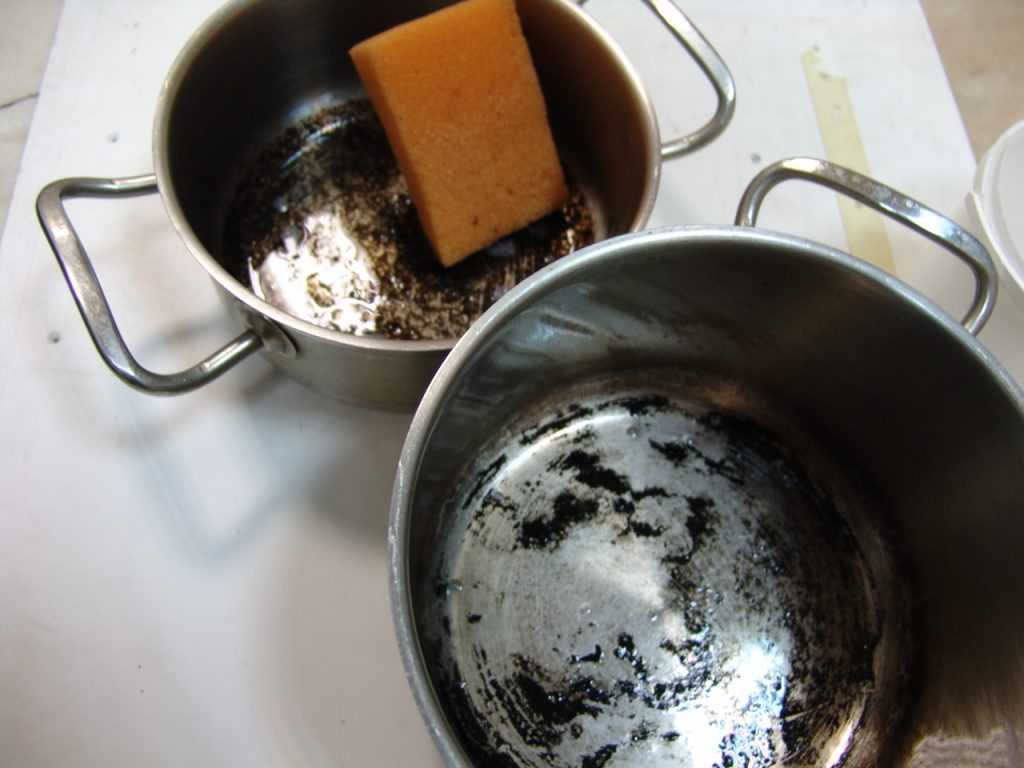 Если пища в стальной кастрюле сильно пригорела, посуду можно спасти. Для этого ее наполняют теплой водой с разведенной поваренной солью на 2 часа, после чего отмывают. Еще один способ, чем чистить: прокипятить в кастрюле мыльный раствор в течении 15-20 минут. Подгоревшая посуда вновь засияет!