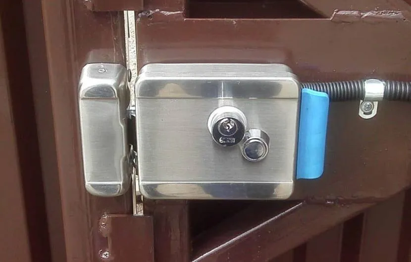 - В электромеханическом замке присутствуют механические провода, для работы устройства нужна подача электричества. Подобные замки более надежны, габаритны, устанавливают на мощные ворота офисных, складских помещений. Но, сложно устанавливать подобные модели и дорого они стоят. В состав устройства входят как механические, так и электронные элементы, монтируется накладным или врезным способом, в конструкции предусмотрен цилиндровый механизм, если отключили электричество, замок можно открыть обычным ключом.