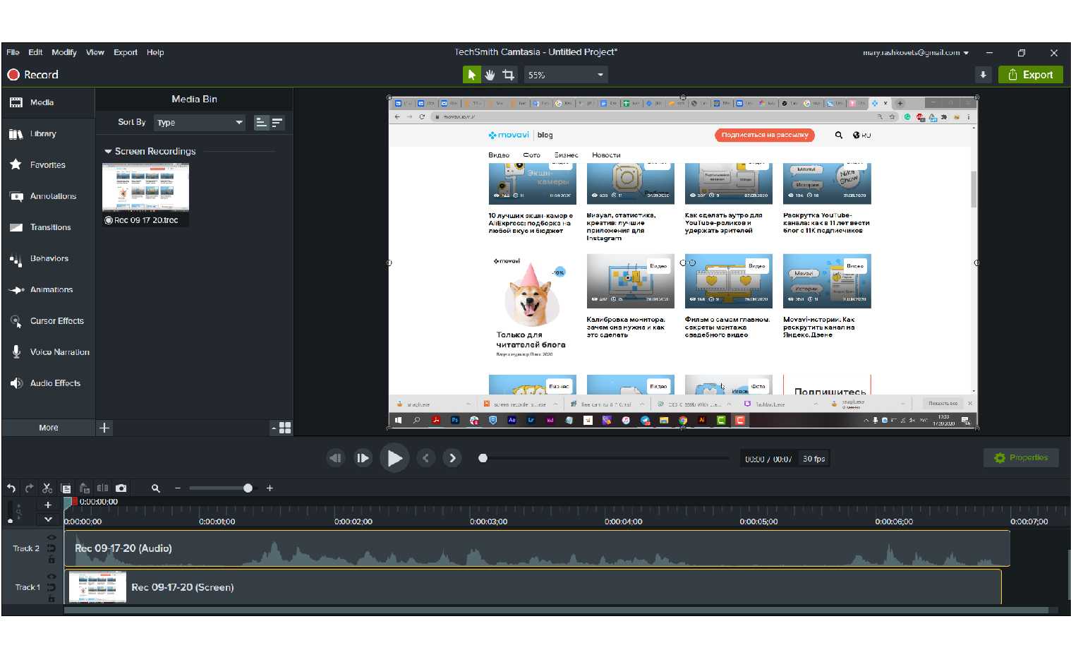 Бесплатная и функциональная. Для пользователя сразу доступен полный функционал, нет никаких ограничений и iSpring Free Cam не станет размещать водяные знаки с названием на итоговом видео. Может не только записать видео с экрана, но и поместит в файл все необходимые системные звуки или запись голоса с микрофона, если необходимо. Кроме того, сразу можно и отредактировать финальный ролик, поправить звук и убрать шумы. Видео можно сохранить на компьютере для дальнейшего использования или опубликовать на своем ютуб-канале через меню.