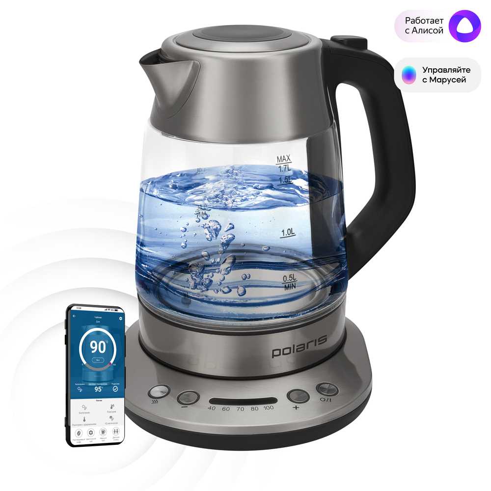 Чайник на 1,7 л и максимальной мощностью 2,2 кВт отличается комфортным управлением через голосовых ассистентов или бесплатное приложение Polaris IQ Home. Есть несколько рецептов вкусных чайных напитков. Прибор предлагает 11 температурных режимов, возможность выбора интенсивности кипячения, установку расписания или поддержку температуры на заданный период. Крышка – съемная, однако заливать воду можно без ее открытия. Подсветка соответствует режиму температуры. Корпус металлопластиковый.