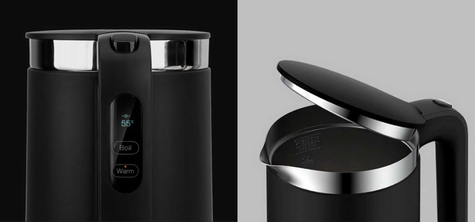 Корпус металлопластиковый, предусмотрен терморегулятор. Смарт-чайник на 1,5 л (1,8 кВт) настраивается через приложение Xiaomi – с ним же можно устанавливать ту или иную температуру. На дисплее OLED отображаются показатели указанного режима. Если воды в приборе нет или температура достигла максимума, то устройство автоматически будет отключено. Предусмотрена опция поддержки температуры на срок до 12 часов. Для хранения шнура питания есть отдельный отсек.