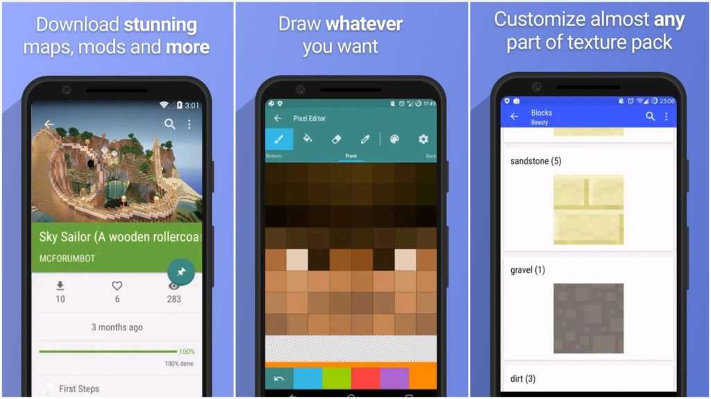 Одно из замечательных приложений Minecraft для поклонников текстурных пакетов. Приложение может загружать карты, моды и скины. Однако большой особенностью является редактор пакетов текстур. Вы можете изменить практически любой пакет текстур, чтобы он выглядел так, как вам нравится. Редактор достаточно прост в использовании, хотя нужно немного привыкнуть. Приложение поставляется с создателем скинов, создателем пакетов текстур и внутриигровым тюнером для настройки реальной игровой механики. Такие вещи, как редактор пакетов текстур, не очень мощный. Еще реклама немного раздражает.
