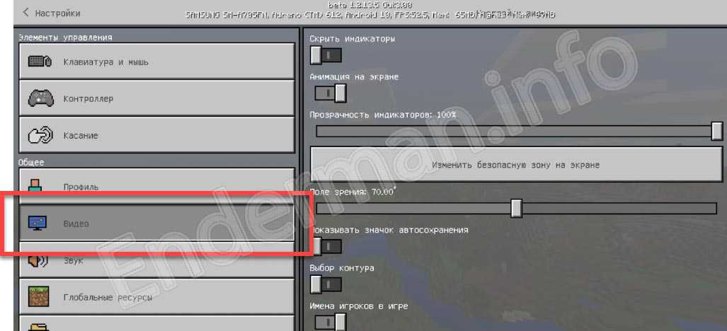 - Сначала мы запускаем игру и переходим к ее настройкам. Дальше в левой части экрана выбираем пункт конфигурации «Видео». Здесь вы найдете массу параметров, включая или отключая каждый из которых сможете сильно увеличить производительность смартфона. Например, значительно влияет на количество кадров в секунду прозрачность индикатора. Если ее убрать на 0, игра начнет работать гораздо быстрее.