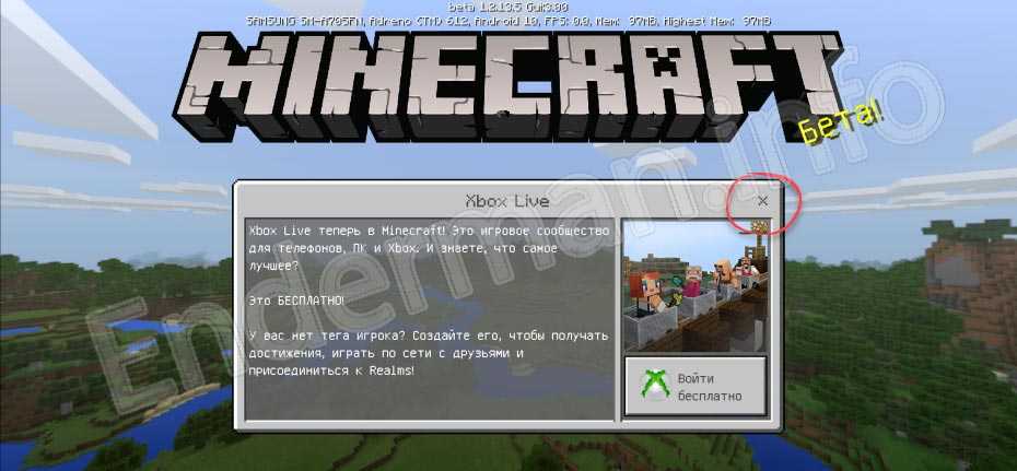 - Теперь, когда мы установили игру, вы можете переходить к ней и начинать наслаждаться пиксельным миром Minecraft PE. Кстати, если в начале запуска игры появятся окно о необходимости авторизации через Xbox Live, просто закройте его, нажав отмеченный красной линией крестик.