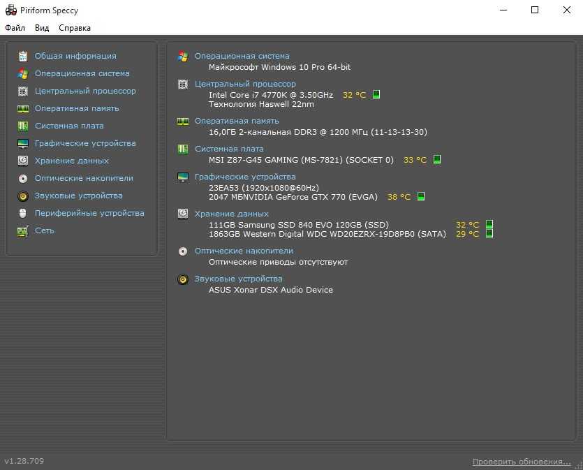 В общем, с помощью программы Speccy можно получить достаточно широкий набор информации о вашем компьютере. Также не стоит забывать, что Speccy имеет функцию по считыванию температуры с различных датчиков, установленных в компьютере. Вы сможете посмотреть температуру своего ПЦ, материнской платы, видеокарты и даже HDD/SSD дисков.