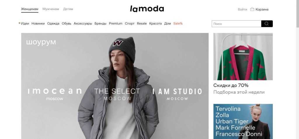 Эта площадка популярна в России и странах СНГ. Здесь можно найти товары популярных мировых брендов. В наличии есть большие размеры и варианты для высоких людей. Доставка и примерка товара – бесплатно, получение производится в пунктах выдачи заказа. Возможна оплата после получения.