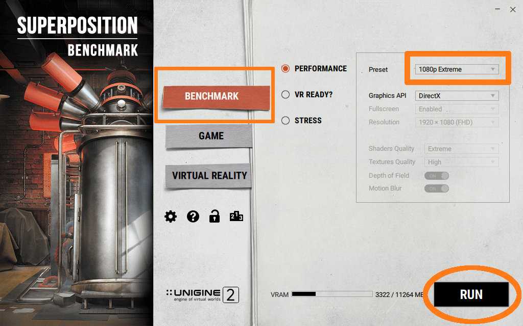 Т.к. мы хотим узнать насколько наша видеокарта производительная и сравнить с результатами других людей, то необходимо выбирать из списка только заранее прописанные конфигурации, поэтому в меню «PERFORMANCE» надо выбрать один из шаблонов настроек в поле Preset: