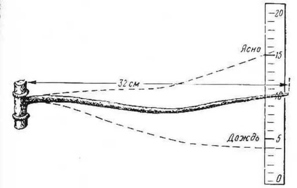 Перед креплением на стену нужно удалить кору. Устройство закрепляют, а рядом с ним рисуют шкалу, где вверху расположена отметка – ясно, а внизу – дождь.