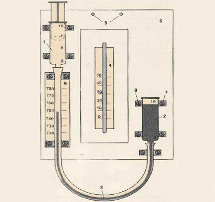 Метеорологические станции до сих пор пользуются барометрами с ртутью, основанными на приборе Торричелли. Считается, что эти измерители самые точные и достоверно показывают изменение давления атмосферы. Но ртуть – вещество опасное для здоровья. Поэтому трубку с жидкостью поместили в латунный короб с отверстием для наблюдения за изменениями столбика. Назвали такой прибор станционным чашечным барометром.