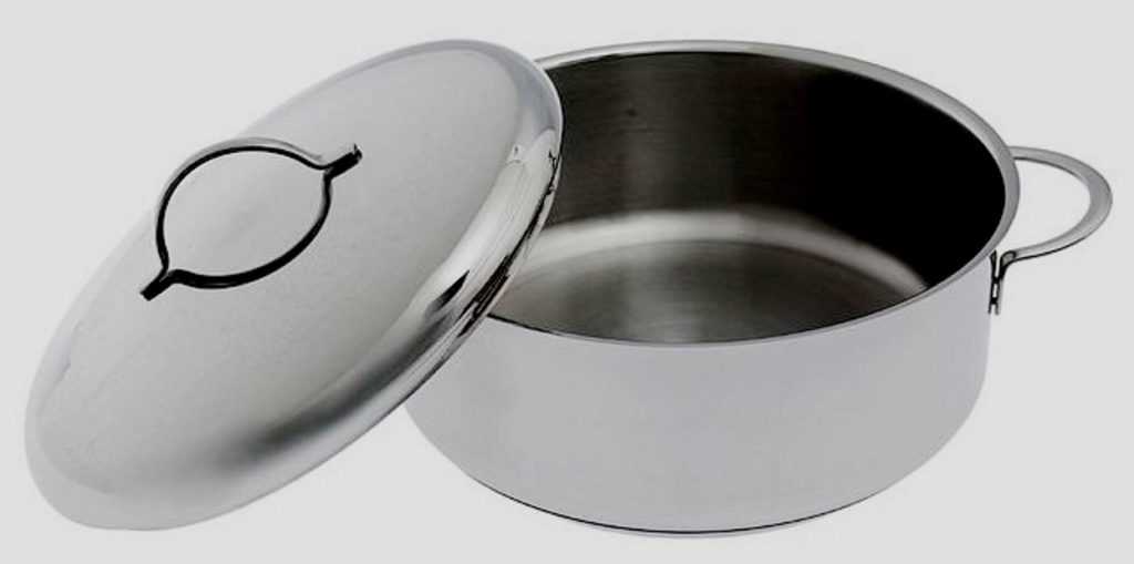Толщина дна из нержавейки не менее 3 мм, толщина стенок — 5 мм. К преимуществам материала относят прочность и долговечность, безопасность для здоровья и простоту в уходе. Изделия из нержавеющей стали равномерно нагреваются, в них хранят еду в холодильнике. К минусам относят стоимость — качественная посуда из нержавейки стоит недешево.