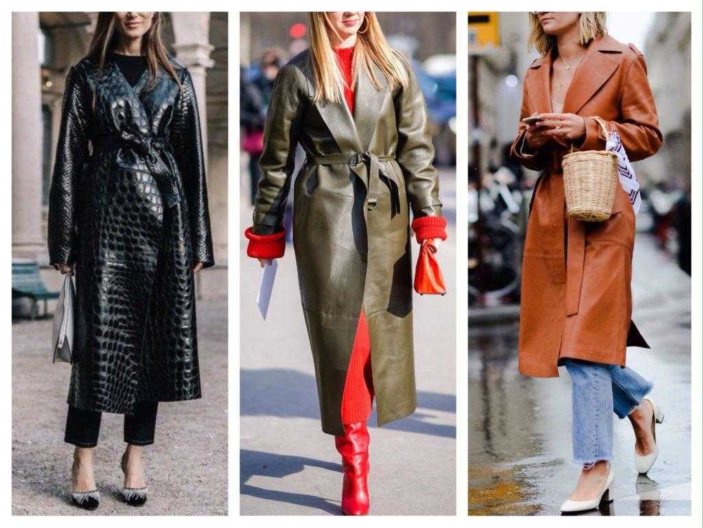 Модели из натуральной кожи стали признаком высокого статуса и безупречного вкуса. Самый популярный вариант имеет среднюю длину и приталенный фасон. Чтобы подчеркнуть нежность натуры, девушки выбирают мужские фасоны. Актуальными остаются длинные тренчи из кожи.