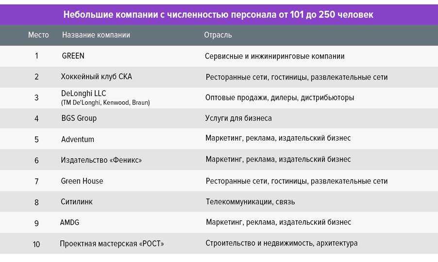 Среди лучших работодателей со штатом от 101 до 250 человек можно встретить компании из разных российских регионов: Санкт-Петербурга, Москвы, Челябинской, Ростовской, Тюменской, Воронежской областей и Республики Карелия. О чем это говорит? Региональные компании выходят из тени и не только следуют HR-трендам, но и сами задают их. Как раз на примере небольших компаний очевидно, что успешность HR-функции зависит не столько от бюджетов, сколько от уровня вовлеченности HR-специалистов в процессы, от системной работы над HR-брендом. GREEN, «Феникс» и «Ситилинк» еще в прошлом году не вошли даже в топ-30, а в этом году показали блестящие результаты.