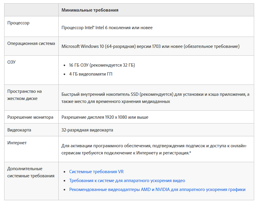 Идея мне показалась слишком простой – мы же не ищем лёгких путей. Поэтому я изучил минимальные требования к железу от самой компании Adobe для Premiere Pro CC 2018 на ОС Windows 10: