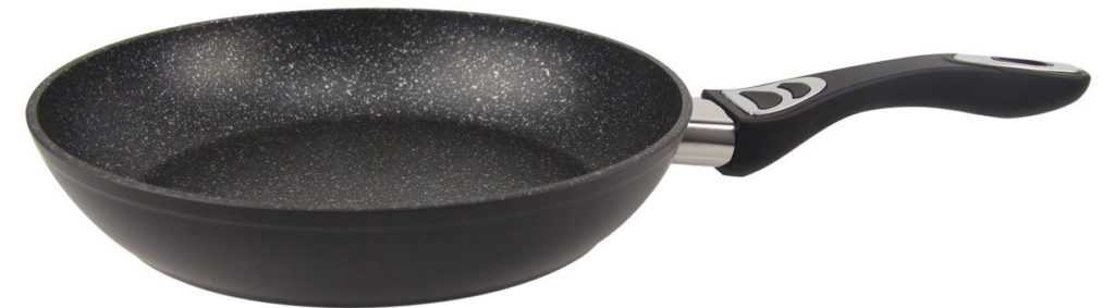 Ещё один вариант для тех, кому хватит небольшого диаметра рабочей поверхности, – это алюминиевая сковорода KUKMARA Granit ultra с диаметром дна 22 см. Сверхпрочное антипригарное покрытие усилено твёрдыми минеральными частицами, что увеличивает срок службы изделия в несколько раз. Оно выполнено из экологически чистых материалов и полностью безопасно для здоровья человека. Покрытию не страшны даже металлические кухонные приборы, мелкие царапины никак не отразятся на функциональности посуды.