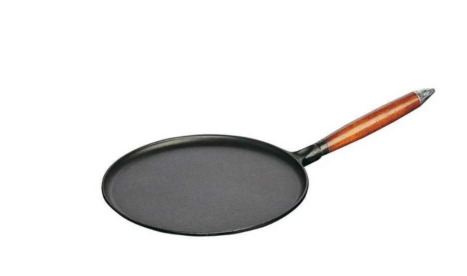 Масса посуды 2,21 кг, сковородка может показаться тяжелой для женщин и детей. Ручка съемная, деревянная, может убираться при хранении, чтобы не занимать дополнительное место.