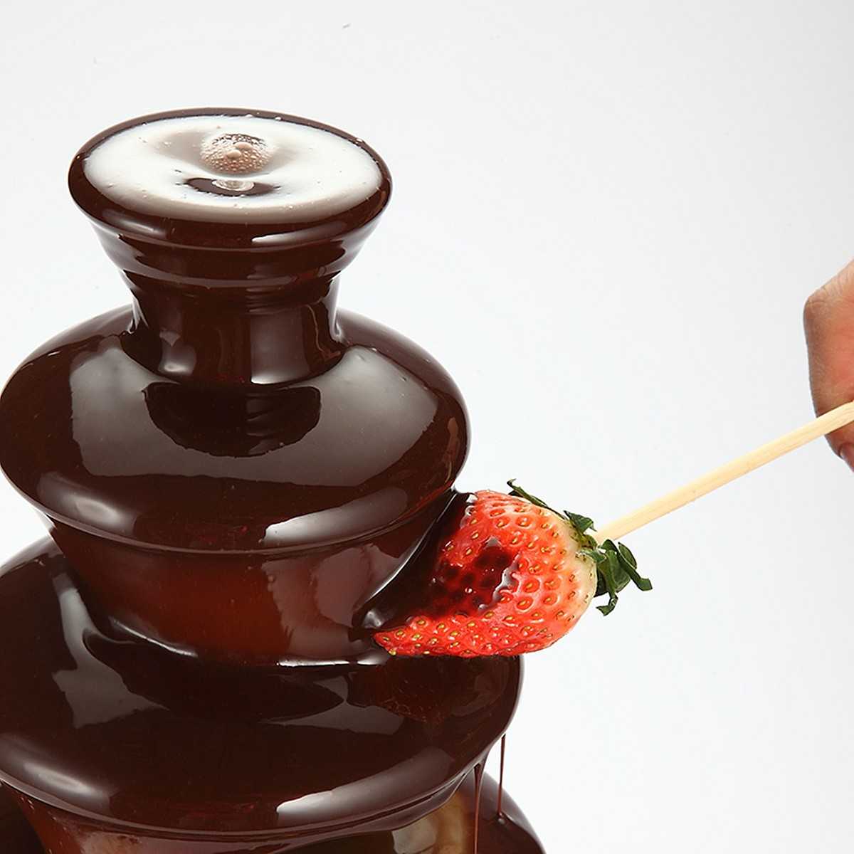 Объем сладкой массы зависит от количества каскадов на фонтане. К шоколаду подают фрукты, крекеры, зефир, выпечку. Прежде их нанизывают на шпажки. Не рекомендуется использовать десерт, который крошится и может загрязнить фонтан. Агрегат обязательно устанавливается на ровную поверхность.