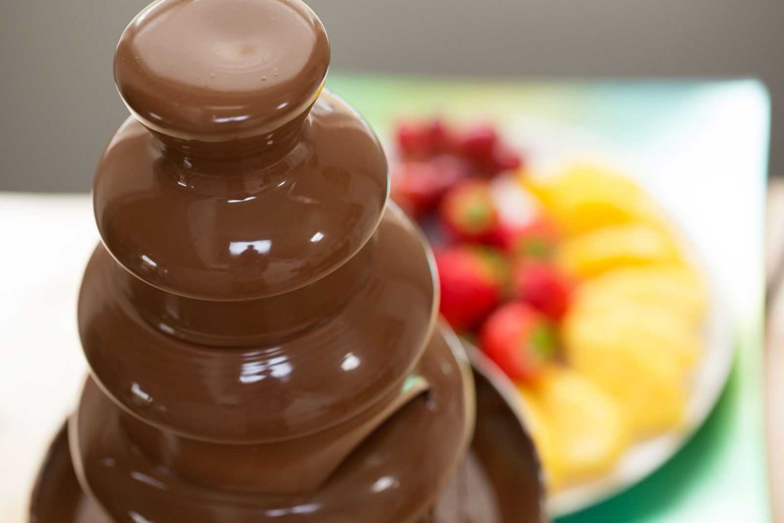 Если цена фонтана выглядит слишком привлекательной, чтобы быть правдой, значит он «работает» не на высококачественном шоколаде. Многие компании, предлагающие аренду шоколадного фонтана на свадьбу и другие праздники, используют недорогой продукт, надеясь на не слишком взыскательного потребителя. Поэтому перед началом мероприятия следует провести дегустацию, чтобы увидеть и попробовать продукт, который будет предложен вашим родным и гостям. Для фонтана подходит шоколад с высоким содержанием какао-масел. Он начинает плавиться уже при температуре около 35° С и обладает небольшой вязкостью. Благодаря этому его удобно использовать совместно с фруктами и выпечкой для приготовления фондю.