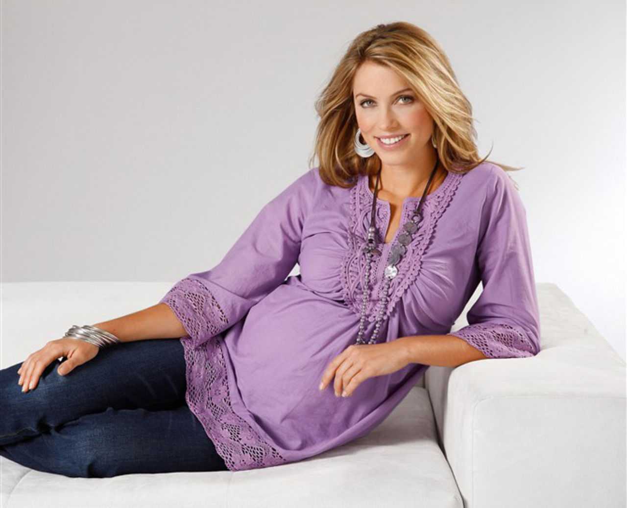 Любителям брюк или джинсов на раннем сроке стоит приобрести специальные, в которых в области пояса вшивается широкая вставка-резинка. Они не будет пережимать живот. Дополнить образ можно либо не облегающей блузкой, туникой, кофтой или свитером. Выбор будет зависеть не только от погоды, но и от температуры помещения.