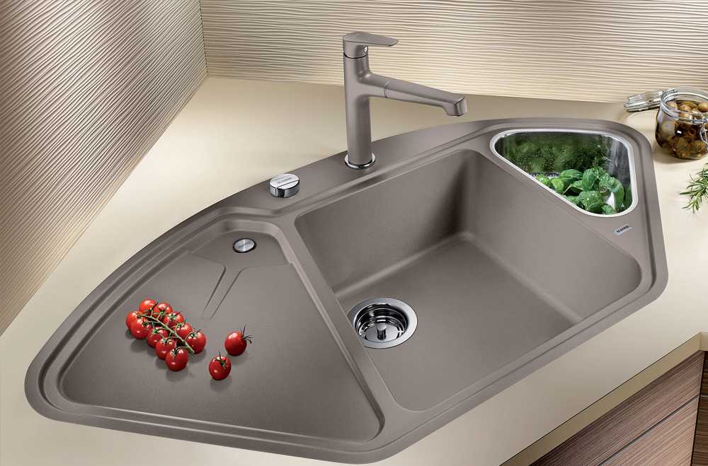 Большая мойка из искусственного камня – плюс, минус ее только в том, что она не уместится в маленькой кухне. Поэтому при ограниченной площади выбирают узкие, но глубокие (около 20%) раковины без крыльев квадратной или круглой формы. Хороший выход – покупка угловой мойки, которая задействует один из углов кухни.