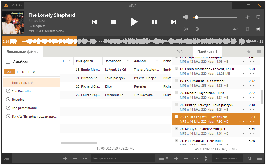 AIMP — это современная русскоязычная программа для воспроизведения музыки, имеющая минималистичный и простой интерфейс. Плеер очень функционален. Кроме удобной фонотеки и простого алгоритма создания аудиофайлов, он может порадовать пользователя эквалайзером с настроенными шаблонами частот, понятным менеджером звуковых эффектов, планировщиком действий для плеера, функцией интернет-радио и аудиоконвертором.