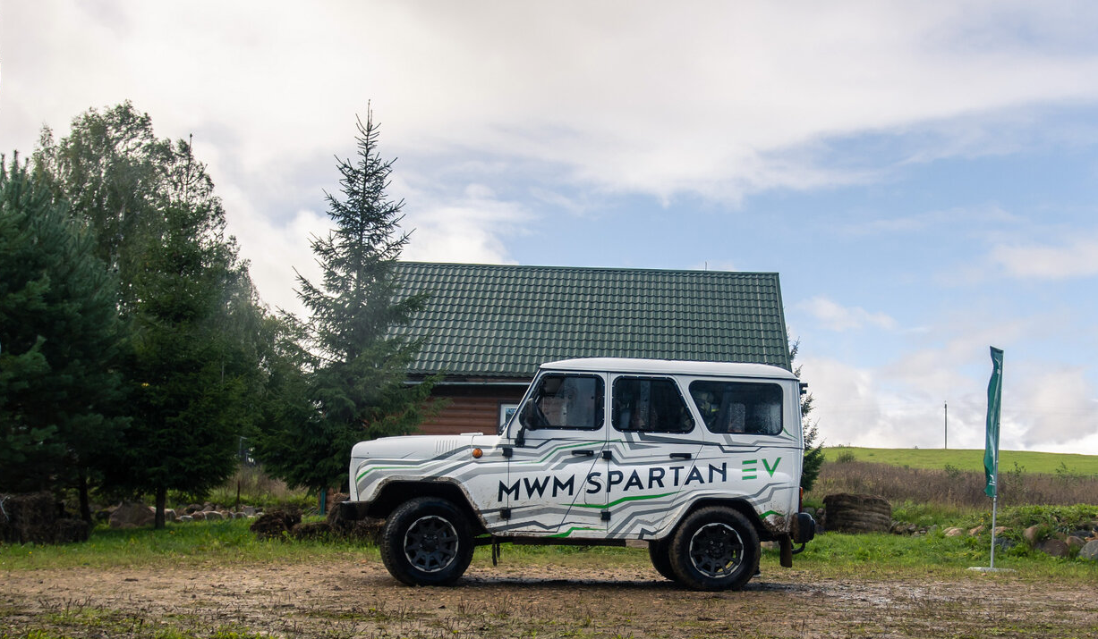В электромобиле вместо штатного, бензинового, «атмосферника» ЗМЗ (134 л.с., 271Нм) установлен синхронный электродвигатель, выдающий максимальные 163 л. с. и 600 Нм. А вот трансмиссия осталась прежней — коробка передач, раздатка, валы, мосты и прочее, вплоть до выхлопной трубы, которая тоже на месте, но теперь из нее ничего не вылетает. Запас хода оценивается в 245 км.