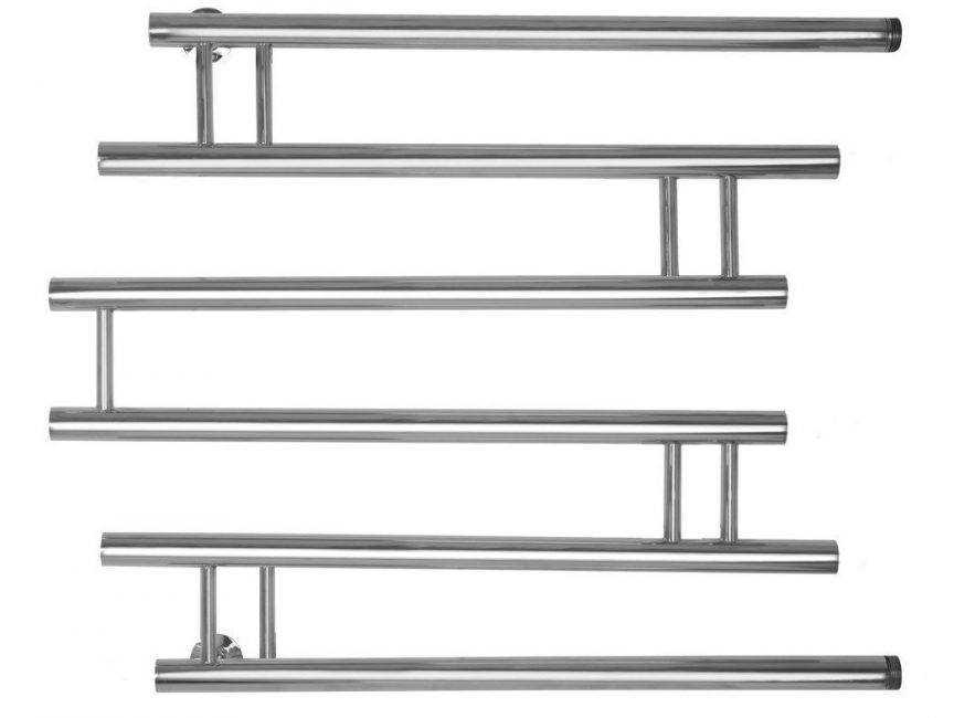 Конструкция и материал изготовления. Этот популярный полотенцесушитель изготовлен из пищевой нержавеющей стали и имеет зеркальные наружные поверхности, образованные хромом. Он похож на лесенку с 8 чуть выгнутыми наружу ступенями и выступающей вперед верхней полкой для хранения сухого белья.